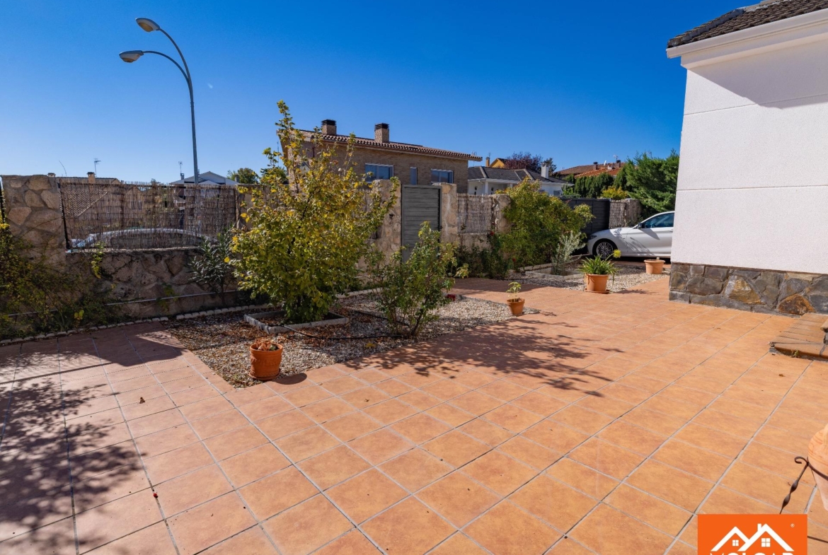 En el exterior, la vivienda destaca por su cuidada zona ajardinada y su piscina privada de cloración salina, ideal para disfrutar de los meses más cálidos con el mínimo mantenimiento. Además, dispone de un porche cubierto, perfecto para reuniones familiares, comidas al aire libre o eventos veraniegos, convirtiéndose en un espacio de ocio muy versátil. La parcela, totalmente llana, facilita el acceso y el uso de todas las zonas exteriores, ofreciendo también un garaje cubierto anexo con capacidad para dos vehículos.